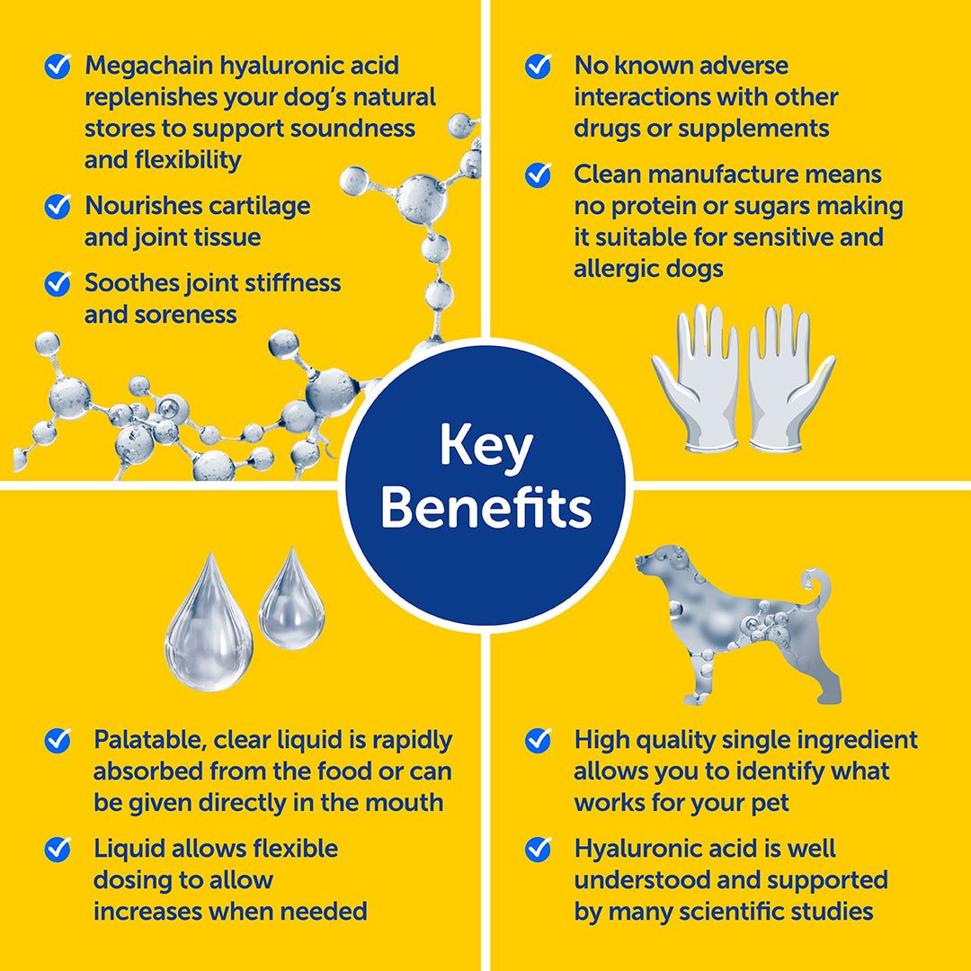 - Helps restore your dog's natural hyaluronic acid levels, crucial for joint lubrication.
