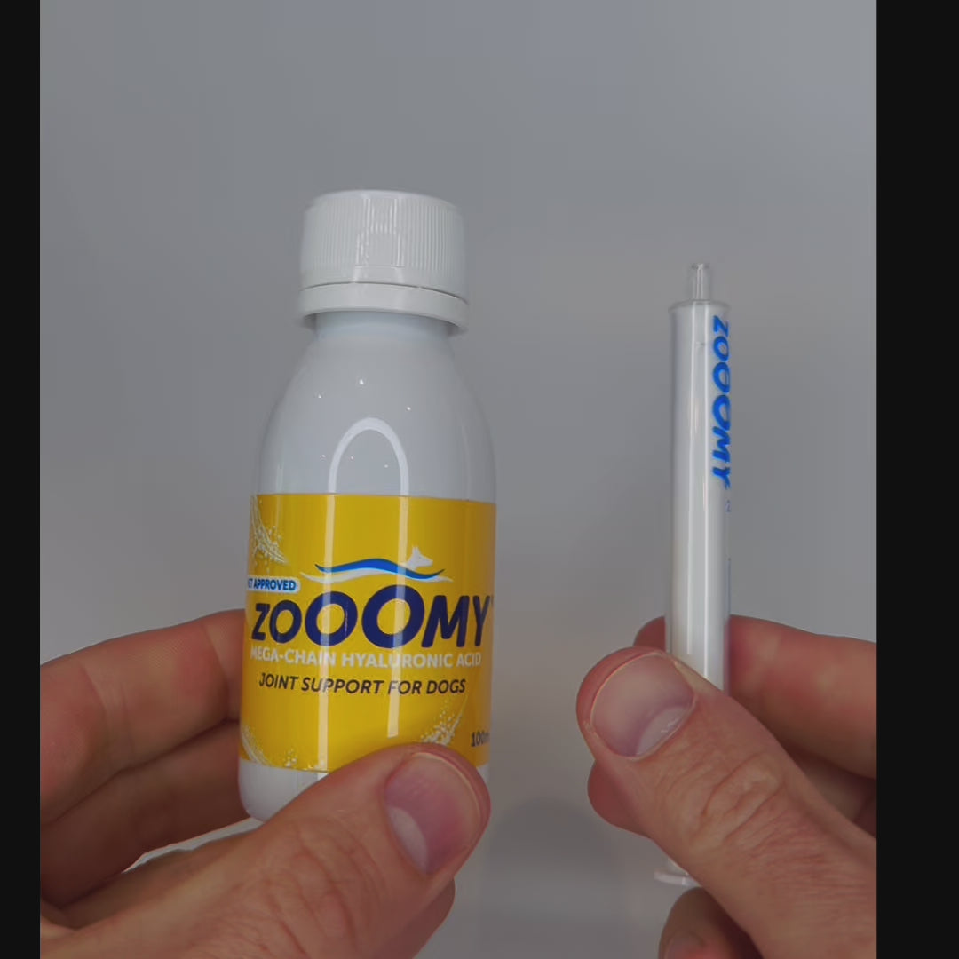 Zooomy is an oral liquid joint supplement packaged for dog owners that contains high purity long chain hyaluronic acid and vitamin C.